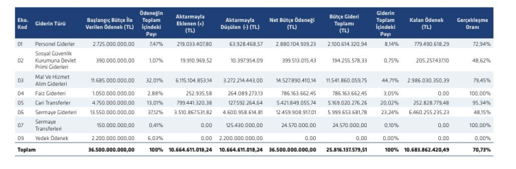 Verilere göre en yüksek bütçe ödeneği Ulaşım Dairesi Başkanlığına ayrıldı. Bu birim için 5,79 milyar lira ödenek ayrılırken, yıl içinde 3,07 milyar lira harcama yapıldı. Mali Hizmetler Dairesi Başkanlığı ise 5,57 milyar liralık ödeneğin 5,39 milyar lirasını kullanarak ödeneğe en yakın gerçekleşme oranına sahip birimlerden biri oldu.