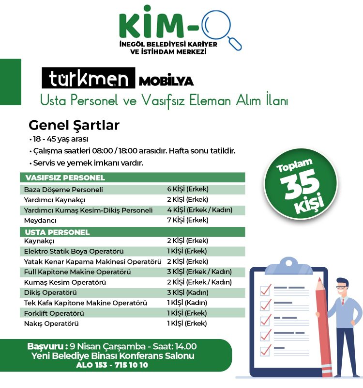 İnegöl Belediyesi İstihdam Merkezinden yapılan açıklamada, Türkmen Mobilya firmasında çalışmak üzere personel alımı yapılacağı duyuruldu. Açıklamada şu ifadelere yer verildi: “İstihdam Merkezimizle iş birliği yapan Türkmen Mobilya firması, İnegöl’de bulunan fabrikada farklı bölümlerde çalışacak usta ve vasıfsız personel alımı yapacak. Aranan genel şartlarda başvuracak kişilerin 18-45 yaş arasında olması gerektiği ifade edildi. Hafta sonları tatil olan firmada çalışma saatleri 08.00-18.00 olarak ifade edildi. Aranan personeller ise şöyle sıralanıyor: Vasıfsız personeller; baza döşeme personeli 6 kişi erkek, yardımcı kaynakçı 2 kişi erkek, yardımcı kumaş kesim-dikiş personeli 4 kişi kadın/erkek, meydancı 7 kişi erkek. Usta personeller; kaynakçı 2 kişi erkek, elektro statik boya operatörü 1 kişi erkek, yatak kenar kapama makinesi operatörü 2 kişi erkek, ful kapitone makine operatörü 3 kişi kadın/erkek, kumaş kesim operatörü 2 kişi kadın/erkek, dikiş operatörü 3 kişi kadın, tek kafa kapitone makine operatörü 1 kişi kadın, forklift operatörü 1 kişi erkek, nakış operatörü 1 kişi erkek personel olmak üzere toplam 35 personel alınacak.