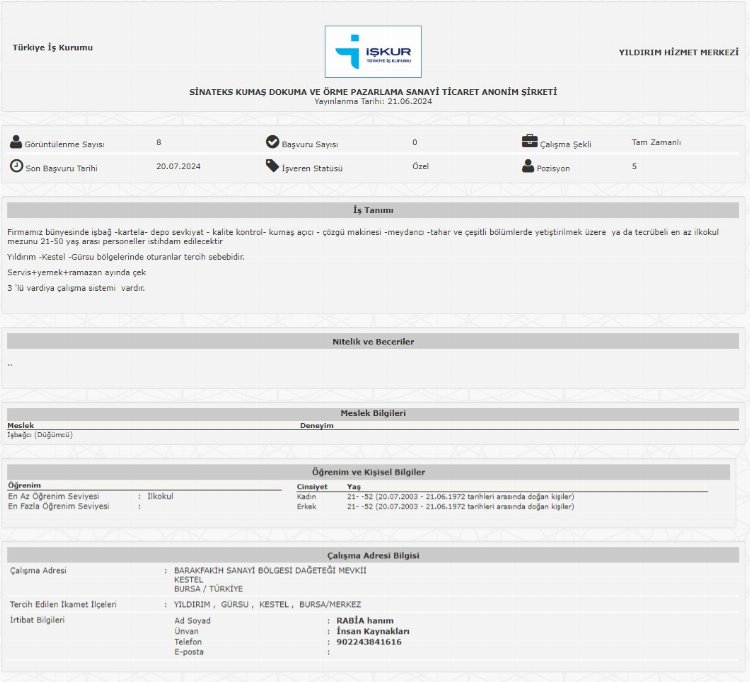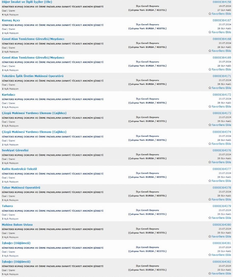 Sinateks; 4 Diğer İmalat ve İlgili İşçiler (Elle), 2 Kumaş Açıcı, 4 Genel Alan Temizleme Görevlisi/Meydancı, 2 Tekstüre İplik Üretim Makinesi Operatörü, 2 Kartelacı, 4 Çözgü Makinesi Yardımcı Elemanı (Cağlıkcı), 2 Sevkiyat Görevlisi, 2 Kalite Kontrolcü-Tekstil, 2 Tahar Makinesi Operatörü, 2 Taharcı, 2 Makine Bakım Ustası, 2 İşbağcı (Düğümcü) ve 5 İşbağcı (Düğümcü) alacak.