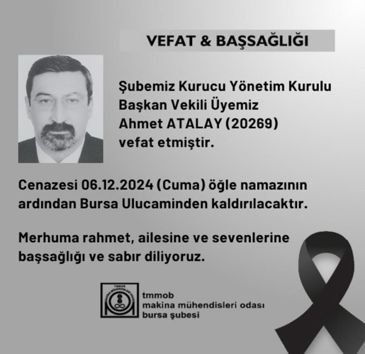 Geçmiş dönem CHP Nilüfer İlçe Başkanı, TMMOB Makina Mühendisleri Odası Kurucu Başkanı ve Eski İKK Sekreteri Ahmet Atalay yaşamını yitirdi.