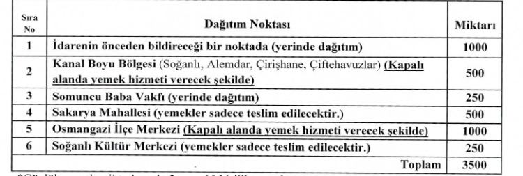 Soğanlı, Alemdar, Çirişhane ve Çiftehavuzlar olarak bilinen Kanal Boyu bölgesinde 500 adet, Somuncu Baba Vakfı'nda 250 adet, Sakarya mahallesinde 500 adet, ilçe merkezinde 1000 adet, Soğanlı Kültür Merkezi'nde 250 adet yemek dağıtılacak. 1000 kişilik yemek ise belediyenin önceden bildireceği noktada verilecek.