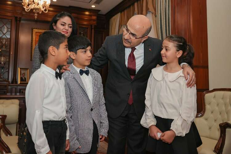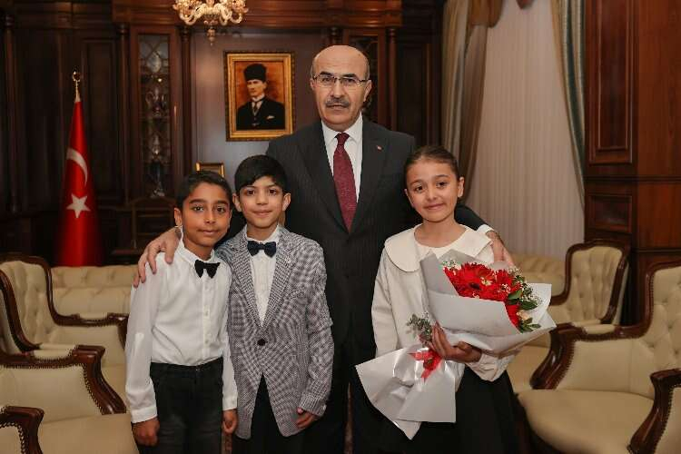 Türkiye BüyükMillet Meclisinin açılışının 104. yıl dönümü ve 23 Nisan Ulusal Egemenlik ve Çocuk Bayramı kutlamaları münasebetiyle İl Milli Eğitim Müdürü Dr. Ahmet Alireisoğlu ile Gülhanım Karasu İlkokulu öğretmen ve öğrencileri, Vali Mahmut Demirtaş’ı makamında ziyaret etti.
