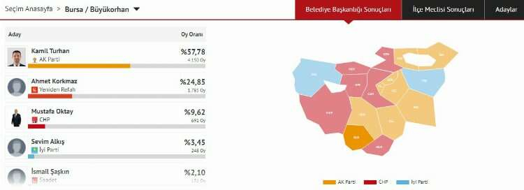 Bursa'nın dağ ilçeleri olarak adlandırılan Orhaneli, Keles, Harmancık ve Büyükorhan'da kesin olmayan sonuçlara göre seçimi kazananlar netleşti.