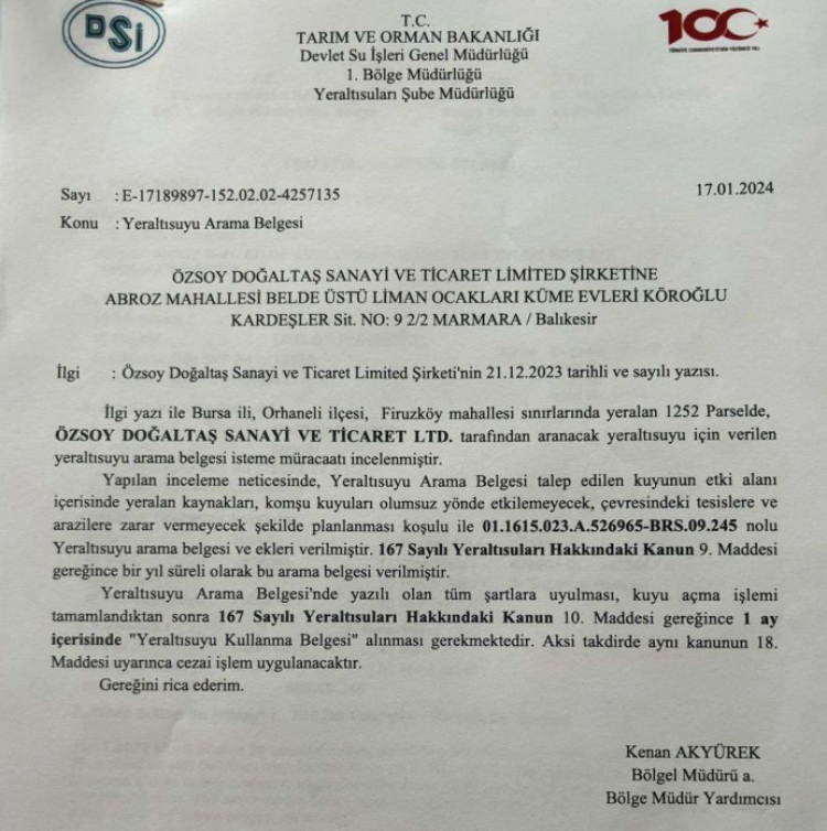 Firma, üretim faaliyetlerinde kullanılacak suyun DSİ izinli kuyudan temin edileceğini, yeraltı suyu arama izinleri olduğunu kaydetti.
