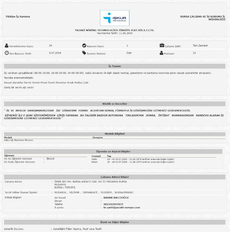Yayımlanan ilanda; 18-45 yaş arası üç vardiyalı çalışabilecek (08:00-16:00, 16:00-24:00, 24:00-08:00), kablo donanımı ile ilgili olarak montaj, paketleme ve bantlama kısmında görev alacak operatörler arandığı belirtildi. Adaylarda tecrübe aranmadığı da not düşüldü.