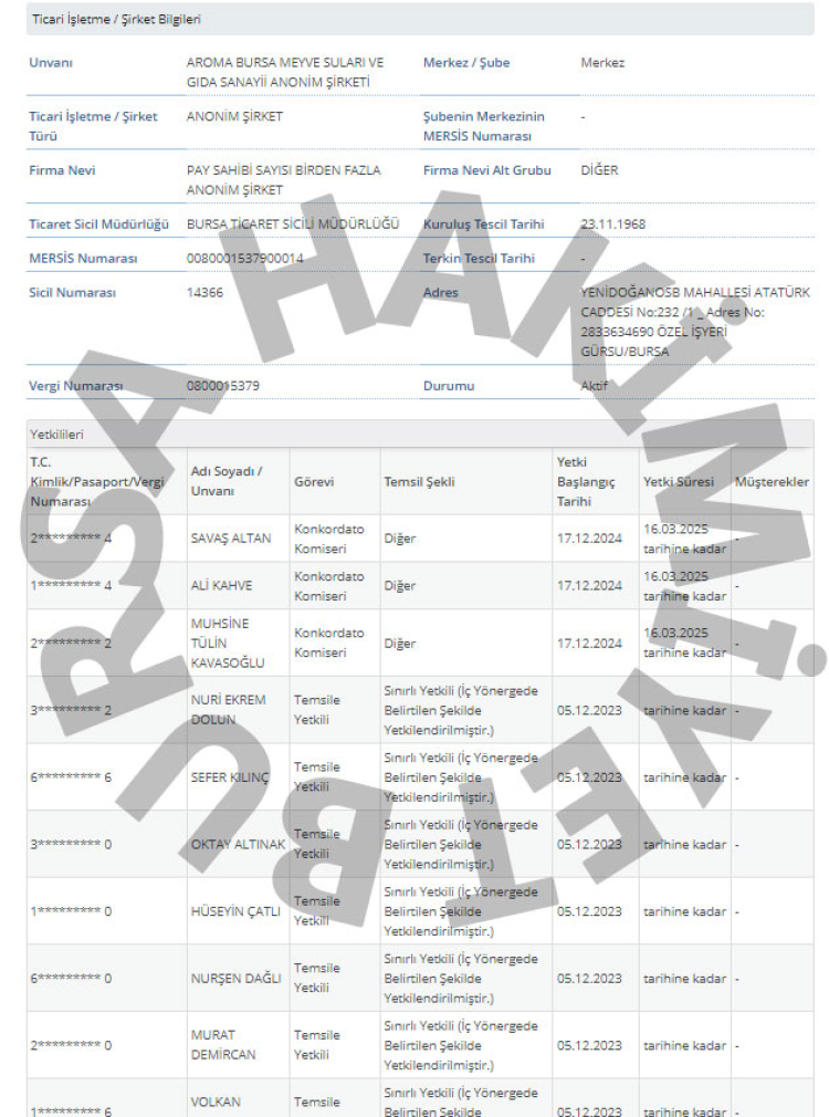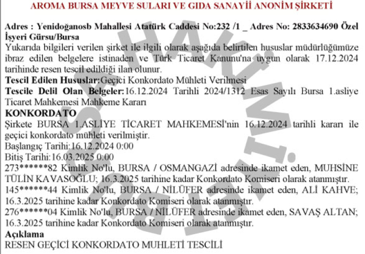 Bursa 1. Asliye Ticaret Mahkmesi, 16 Aralık 2024 tarihli kararı ile Aroma'ya geçici konkordato mühleti verdi.