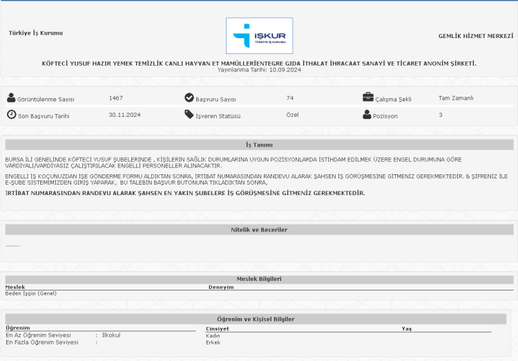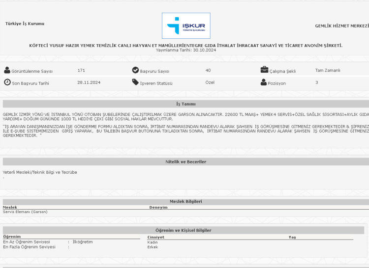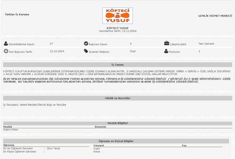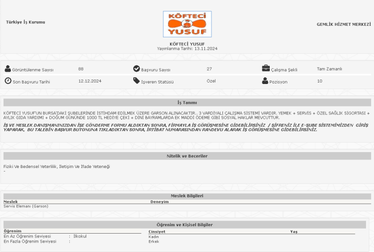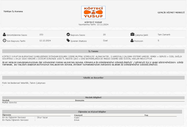 Çeşitli pozisyonlarda 28 personel alımı yapacağını duyururan Köfteci Yusuf, iş ilanları İŞKUR üzerinden paylaştı.