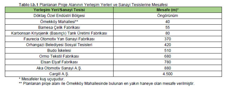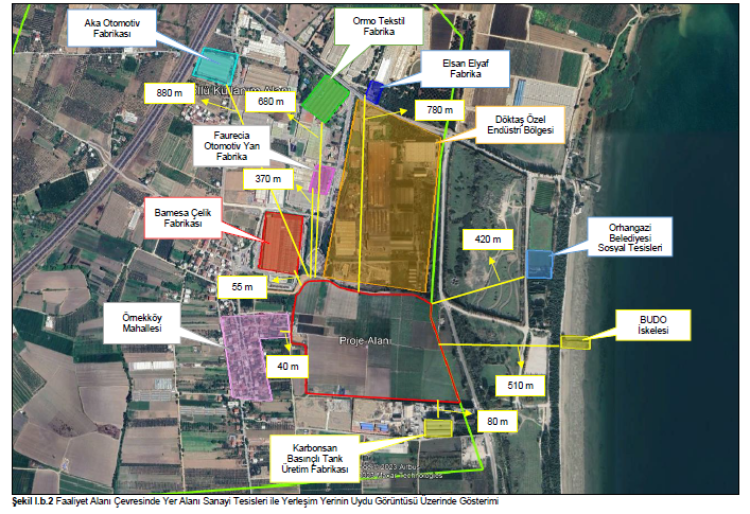 Proje alanının kuzey yönünde Döktaş Özel Endüstri Bölgesi, kuzeydoğu yönünde ve yaklaşık 80 metre mesafede Bamesa Çelik Fabrikası, güney yönünde ve 120 metre mesafede Karbonsan Kriyojenik (Basınçlı) Tank Üretimi Fabrikası, kuzey yönünde yaklaşık 420 metre mesafede Faurecia Otomotiv Yan Sanayi Fabrikası, doğu yönünde 450 metre mesafede Orhangazi Belediyesi Sosyal Tesisleri ve 620 metre mesafede BUDO İskelesi, kuzey yönünde 740 metre mesafede Ormo Tekstil Fabrikası, 930 metre mesafede Aka Otomotiv Sanayi A.Ş. ve 4.500 metre güneybatısında ise CARGILL A.Ş.’ye ait fabrika ve işletmeler bulunuyor.