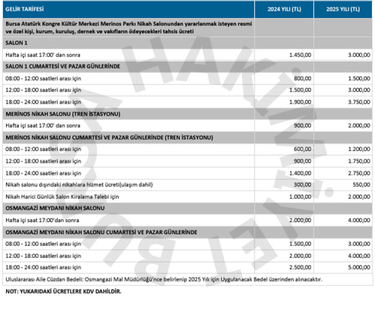 900 bine yakın ilçe sakinine hizmet veren Osmangazi Belediyesi, Merinos ve Osmangazi Meydanı'ndaki nikah salonlarına yüzde 80 ile yüzde 122 arasında değişen oranlarda zam yaptı.