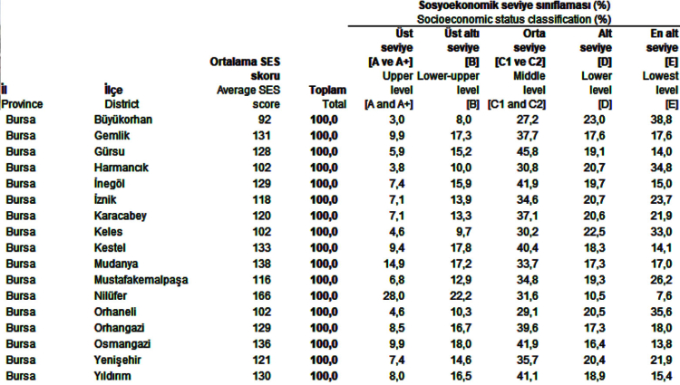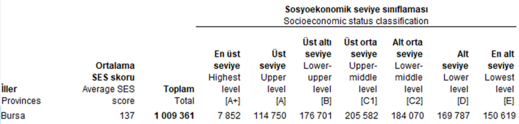 İl düzeyinde en üst [A+] ve üst [A] sosyoekonomik seviye gruplarındaki hanehalkları, Türkiye içindeki oranlarına göre sıralandığında, bu seviyelerdeki hanehalklarının en fazla olduğu iller yüzde 28,6 ile İstanbul, yüzde 11,5 ile Ankara, yüzde 6,7 ile İzmir, yüzde 3,9 ile Bursa ve yüzde 3,3 ile Antalya oldu.