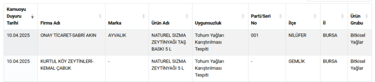 10 Nisan tarihli son güncellemede; Onay Ticaret- Sabri Akın'a ait Ayvalık marka zeytinyağlarına tohum yağları karıştırıldığı bildirildi.