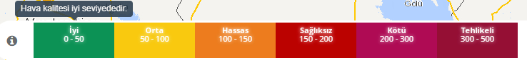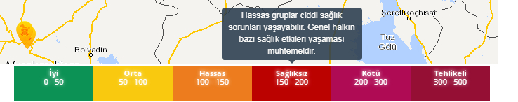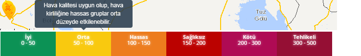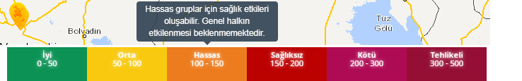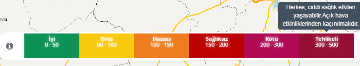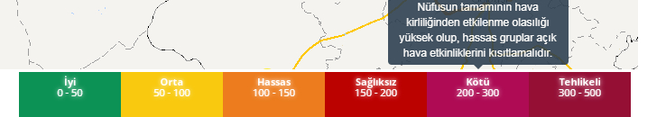 Bu veriler doğrultsunda şehirlerde yaşanabilirlik düzeyi olarak sarı kategori yani 50-100 aralığı kabul edilmekte. Sarı kategori ve üstü yani 100 ve üzeri ise hassar gruplar için sağlık sorunları oluşturabilir.