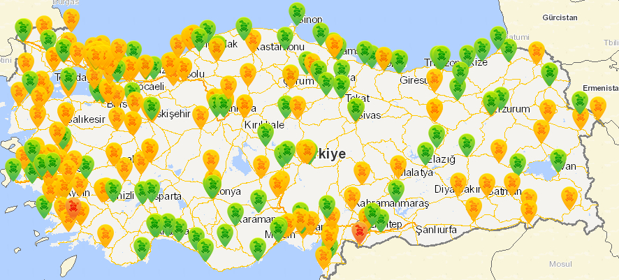T.C. Çevre, Şehircilik ve İklim Değişikliği Bakanlığı'na göre ise Türkiye'nin hava kalitesi sarı ve yeşil kategoriden oluşmakta, yer yer ise bazı şehirlerde turuncu kategoriye geçişler yer almakta.