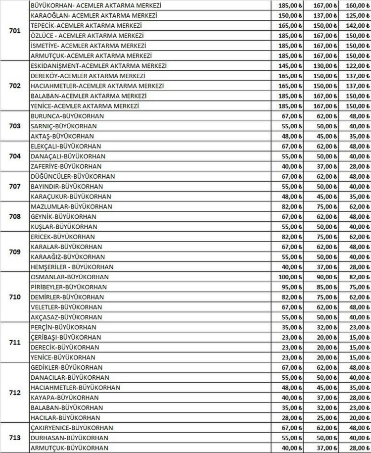İŞTE ZAMLI YENİ FİYAT TARİFELERİ: