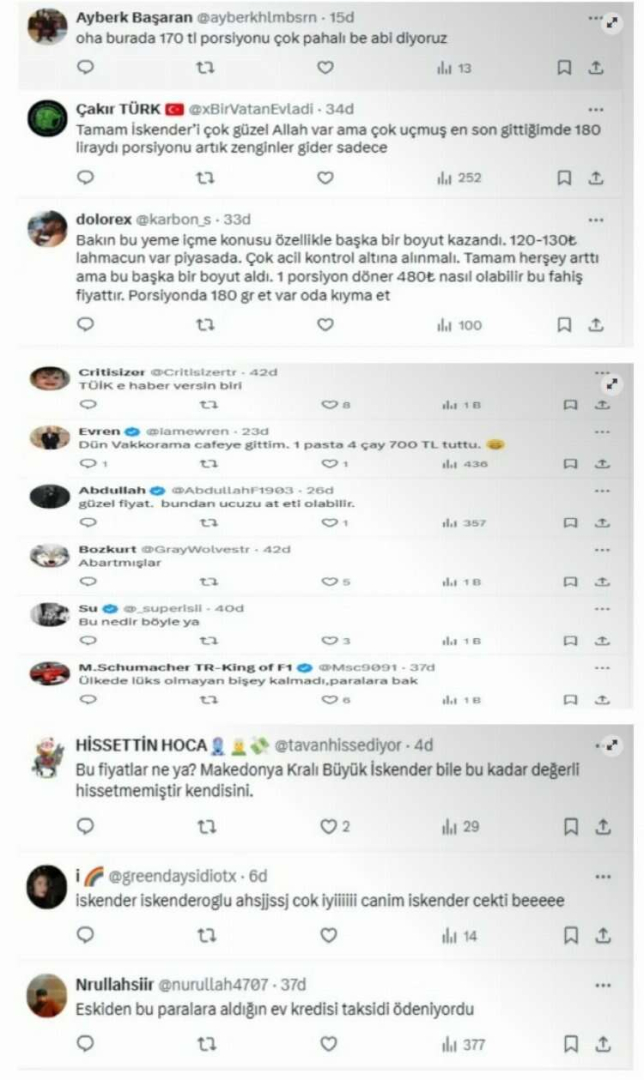 Bursa'da bir restorana ait olan bu yemek menüsü sosyal medya kullanıcılarını şaşkına çevirirken kullanıcılar bu duruma isyan etti. Menüyü ilişkin yorumlarda bulunan sosyal medya kullanıcıları “bu nedir böyle ya”, “ülkede lüks olmayan bir şey kalmadı paralara bak”, “eskiden bu paralara aldığın ev kredisi taksiti ödeniyordu” gibi yorumlar yaptılar.
