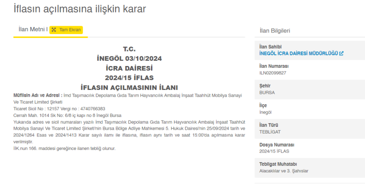 İnegöl İcra Dairesi Müdürlüğü, İmd Taşımacılık Depolama Gıda Tarım Hayvancılık Ambalaj İnşaat Taahhüt Mobilya Sanayi Ve Ticaret Limited Şirketi'nin'nin iflasının açılmasına ilişkin karar yayımladı.