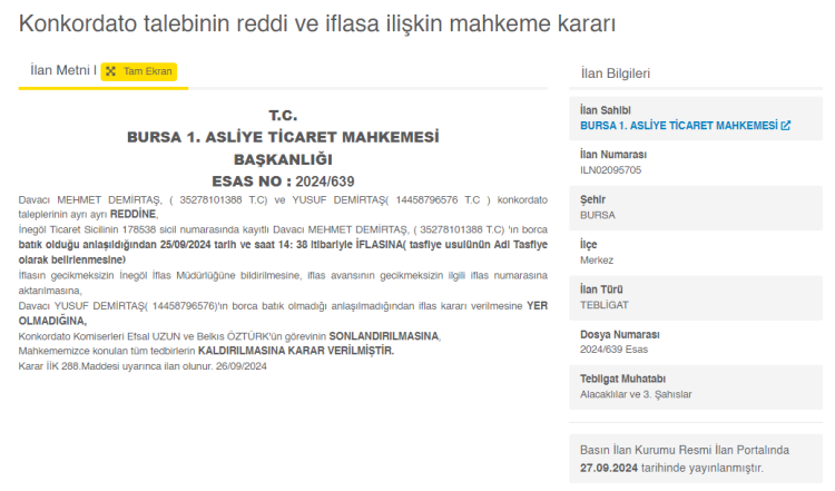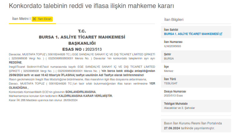 Bu kapsamda şahıs ve firmaların konkordato talebini değerlendiren Bursa 1. Asliye Ticaret Mahkemesi, Ege Sandalye, Alsemo Mobilya ve Mehmet D.'nin konkordato talebini reddetti.