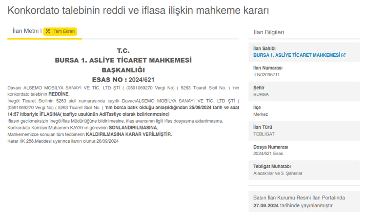Bu kapsamda şahıs vefirmaların konkordato talebini değerlendiren Bursa 1. Asliye Ticaret Mahkemesi, Ege Sandalye, Alsemo Mobilya ve Mehmet D.'nin konkordato talebini reddetti.