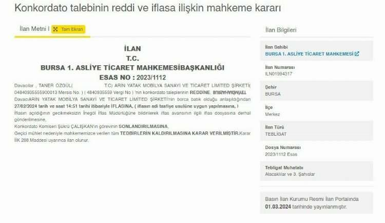 Konkordato mühletini uzatma talebi reddedilen Arin Yatak Mobilya Sanayi Ve Ticaret Limited Şirketi adlı firma ise iflas etmişti.