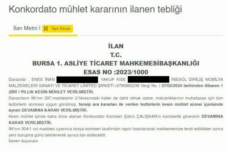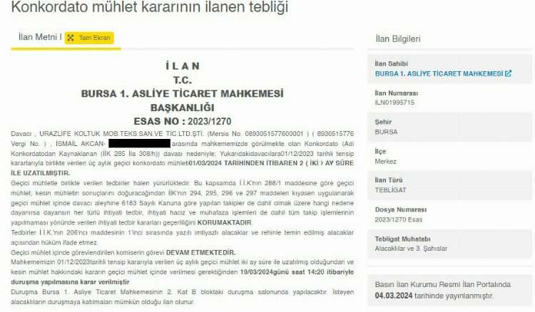 Davacı, Urazlife Koltuk Mob.teks.san.ve Tic.ltd.şti. (Mersis No. 0893051577600001 ) ( 8930515776 Vergi No. ), İsmail Akcan arasında mahkememizde görülmekte olan Konkordato (Adi Konkordatodan Kaynaklanan (İİK 285 İla 308/h)) davası nedeniyle; Yukarıdaki davacılara 01/12/2023 tarihli tensip kararlarıyla birlikte verilen üç aylık geçici konkordato mühleti 01/03/2024 tarihinden itibaren 2 ( iki ) ay süre ile uzatılmıştır.