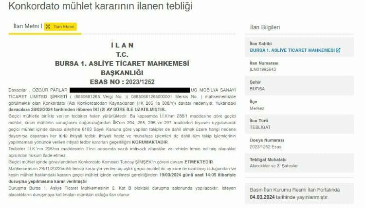 Davacılar, Özgür Parlar, Ug Mobilya Sanayi Ticaret Limited Şirketi ( (8850681265 Vergi No. ) ( 08850681265000001 Mersis No. ) mahkememizde görülmekte olan Konkordato (Adi Konkordatodan Kaynaklanan (İİK 285 İla 308/h)) davası nedeniyle; Yukarıdaki davacılara 28/02/2024 tarihinden itibaren iki (2) ay süre ile uzatılmıştır.