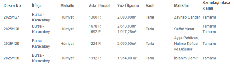 Ada ve parsel numaralarıyla birlikte yüzölçümleri ve maliklerine ilişkin bilgiler ilan metninde paylaşıldı.