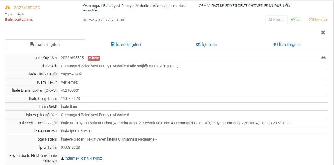 Osmangazi Belediyesi, Panayır Mahallesi Aile Sağlığı Merkezi inşaatı işi yapım işinin 4734 sayılı Kamu İhale Kanununun 19'uncu maddesine göre açık ihale usulü ile ihale edileceğini duyurmuştu.