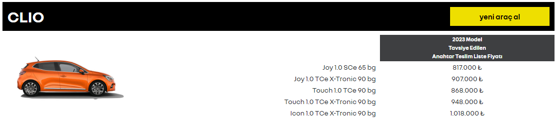 İŞTE RENAULT CLİO’NUN 2023 TEMMUZ AYI İTİBARİYLE GÜNCEL FİYAT LİSTESİ ŞU ŞEKİLDE: