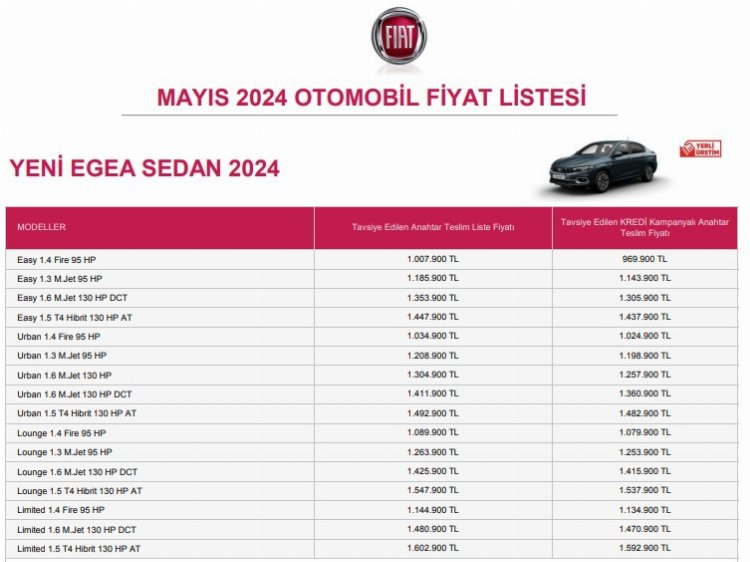 Geçtiğimiz ay fiyatlarını sabit tutan Bursa'nın otomotiv devi Tofaş Fiat, Mayıs ayı zamlı fiyat listesini duyurdu. İşte 2024 Mayıs ayı zamlı binek araçları fiyat listesi... Tofaş Fiat Egea Sedan, Egea Cross, Egea Hatchback, Egea Cross Wagon fiyatları... 2024 Fiat Egea fiyatı ne kadar oldu? İşte tüm ayrıntılar...