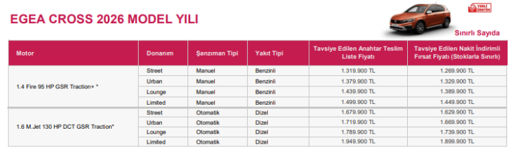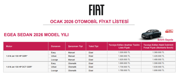 Bursa'da üretim yapan TOFAŞ Fiat, 2026 yılının ilk fiyat listesini resmen yayımladı. Firma bu ay tüm otomobillere zam yaptı. Egea, 1.4 Fire seçeneğinin adadan ayrılmasıyla pahalı bir noktaya ulaştı. İşte sıfır kilometre Fiat otomobillerin güncel fiyatları...