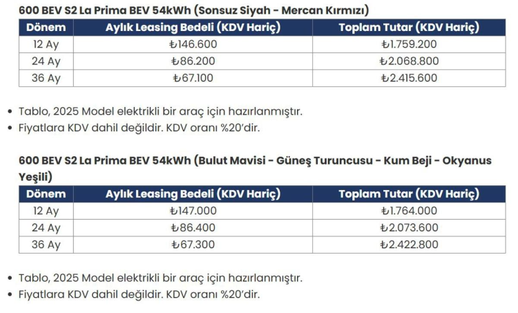 Versiyonu: 600e 115 kW/156 HP - 54 kwh La Prima. Donanım: La Prima. Şanzıman Tipi: Otomatik. Yakıt Tipi: Elektrikli. Fiyatı: 1.969.900 TL. Kampanyalı Fiyatı: 1.959.900 TL.