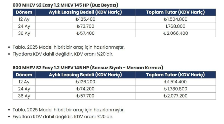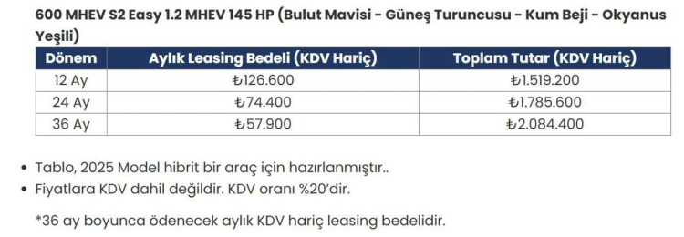 Aşağıda ilgili modellerle alakalı satış fiyatları üzerinden hazırlanan örnek 12, 24 ve 36 ay vadeli aylık ve dönem sonu leasing ödeme planları yer alıyor.