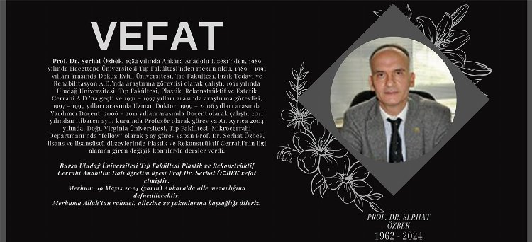 Bursa Uludağ Üniversitesi Tıp Fakültesi Plastik Cerrahi A. B. Dalı öğretim üyesi Prof. Dr. Serhat Özbek hayatını kaybetti.
