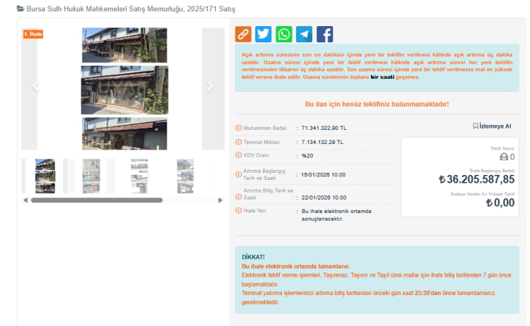 Elektrik, su, doğalgaz, telefon ve kanalizasyon gibi tüm belediye hizmetlerinden yararlanan taşınmaz için açık artırma 15-22 Ocak tarihleri arasında esatis.uyap.gov.tr üzerinden yapılacak. İlanda, taşınmazlar için 36 milyon 205 bin TL muhammen bedel istenirken, bilirkişi raporunda toplam değer 71 milyon 341 bin TL olarak kayda geçti.