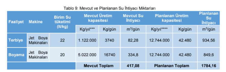 Tesiste gerçekleştirilen kumaş yıkama, terbiye, boyama ve baskı işlemleri sırasında kullanılan su ihtiyacı artacak.