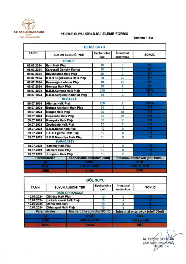 Büyükşehir Belediyesi Gemlik Narlı Halk Plajı, Karacaali Gençlik Kampı, Küçükkumla Halk Plajı, Büyükşehir Belediyesi Kurşunlu Kadınlar Plajı, Hasanağa Kadınlar Plajı, Büyükkumla Halk Plajı, Gemsaz Halk Plajlarında 'iyi kalite su' belirlenirken Büyükşehir Belediyesi Kumsaz Halk Plajı 'orta kalite su', Büyükşehir Belediyesi Mudanya Eğerce Halk Plajı, Büyükşehir Mesudiye Halk Plajı, Büyükşehir Eşkel Halk Plajı, Zeytinbağı Halk Plajı, Coşkunöz Plajı, Burgaz Halk Plajı, Kumyaka Halk Plajı, Burgaz Altınkum Halk Plajlarında 'iyi kalite su' tespit edilirken, Altıntaş Halk Plajı 'orta kalite su' Karacabey Malkara Halk Plajı, Yeniköy Halk Plajı, Kurşunlu Halk Plajları plajlarında 'iyi kalite su', İznik Gölü Göllüce Halk Plajı, İnciraltı Mevki Halk Plajı, Darka Tatil Köyü ve Orhangazi Halk Plajı 'iyi kalite su' olarak belirlendi.