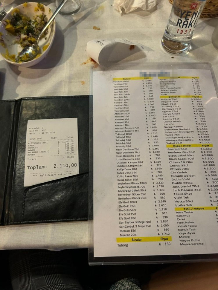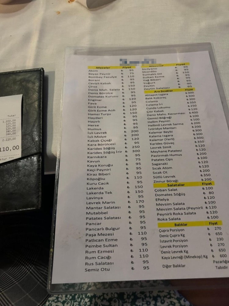 Menüde 850 TL'lik alkolün fiyatı fişte 1200 TL; favanın menüde 95, fişte 125 TL; Köpoğlunun menüde 110, fişte 125 TL; kavunun menüde 75, fişte 120 TL; kalamarın ise menüde 300, fişte ise 380 TL olarak fiyatlandırıldığı görüldü.