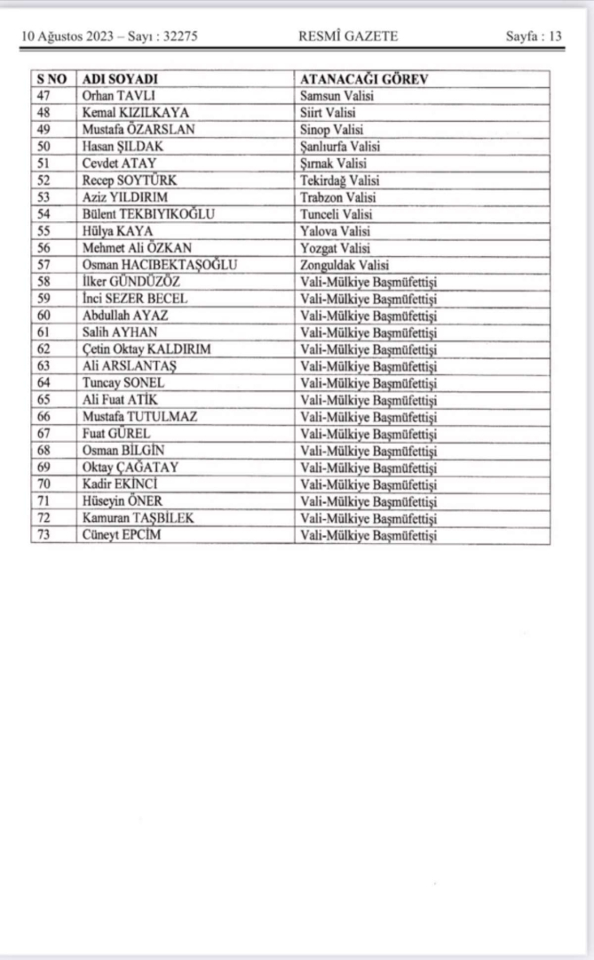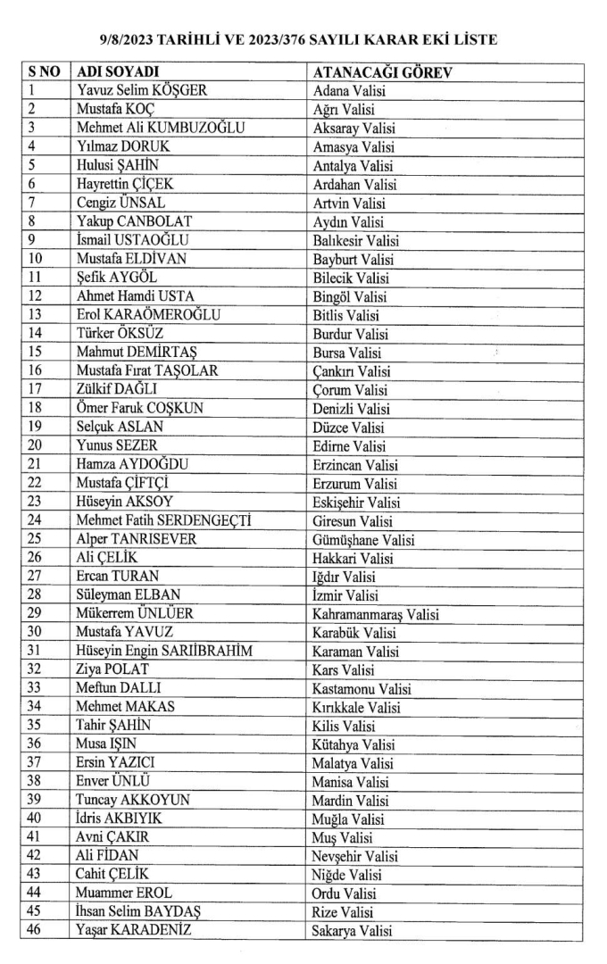 İŞTE YENİ ATANAN VALİLERİN LİSTESİ