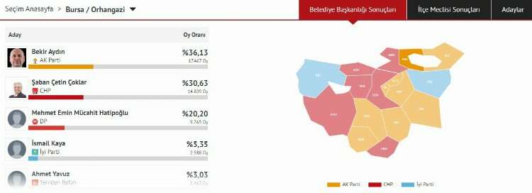 Sayımların tamamlanmasıyla kesin olmayan sonuçlara göre; seçimi AK Parti'nin adayı Bekir Aydın, Bursa Orhangazi Belediye Başkanı oldu.