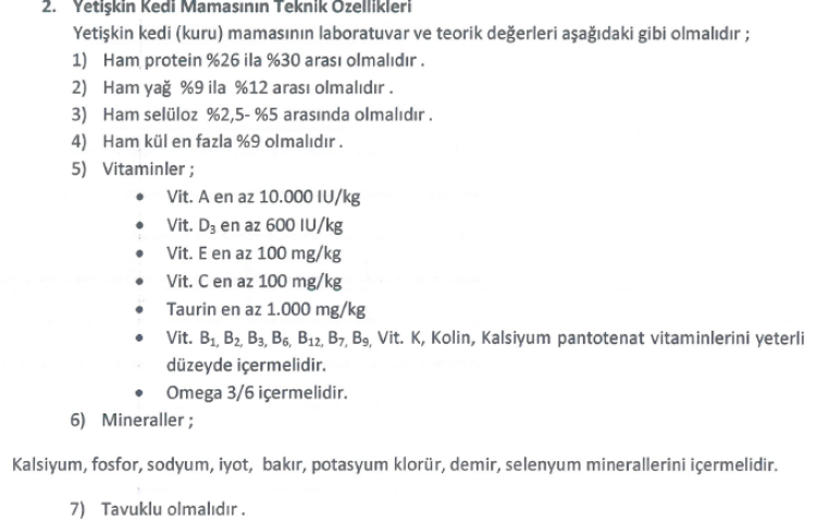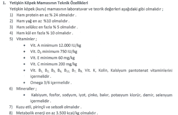 İhale şartnamesinde; Mamaların köpeklerin ve kedilerin günlük beslenme ihtiyaçlarını tam ve dengeli bir biçimde karşılamak üzere formüle edilmiş ve doğal ürünler kullanılarak üretilmiş olması gerektiği ifade edildi.
