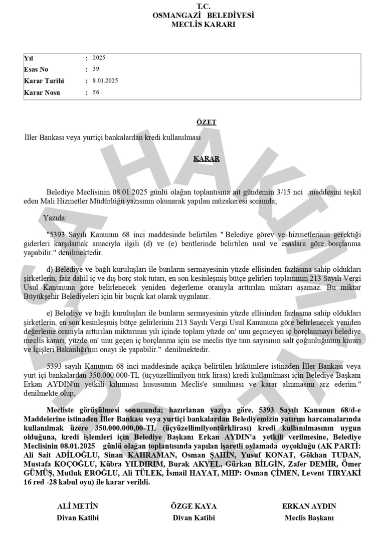Bursa Osmangazi Belediye Meclisi, yatırım harcamalarında kullanmak amacıyla 350 milyon TL'lik kredi kullanımına onay verdi.