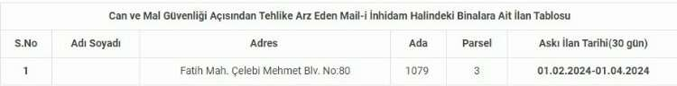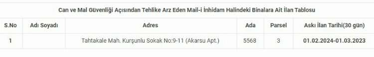 Yıkımı yapılacak binalardan birinin Tahtakale Mahallesi Kurşunlu Sokak No:9-11 (Akarsu Apartmanı) olduğu diğerinin ise Fatih Mah. Çelebi Mehmet Blv. No:80 olduğu belirtildi.