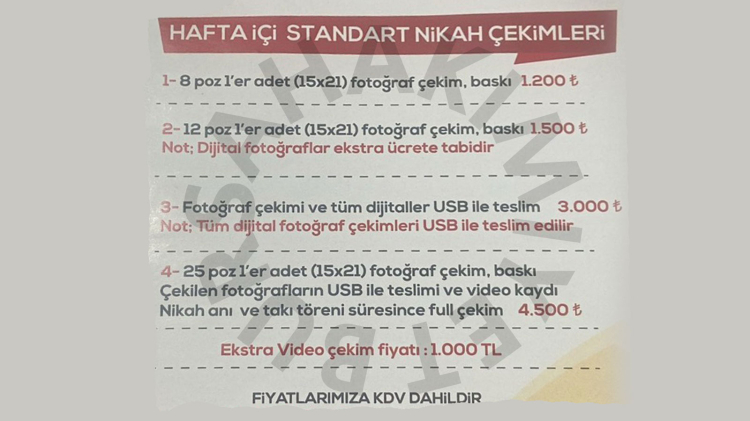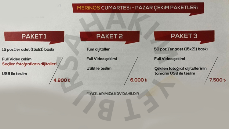 Halihazırda Merinos Nikah Salonu'nun fotoğraf ve video çekim işlerini üstlenen firma hafta içi ve hafta sonu olmak üzere 2 ayrı tarife ile hizmet veriyor.