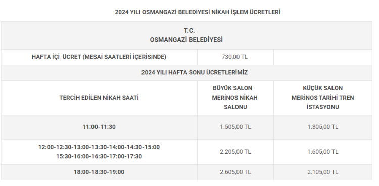 Osmangazi Belediyesi'nin güncel nikah işlem ücretleri ise şöyle: