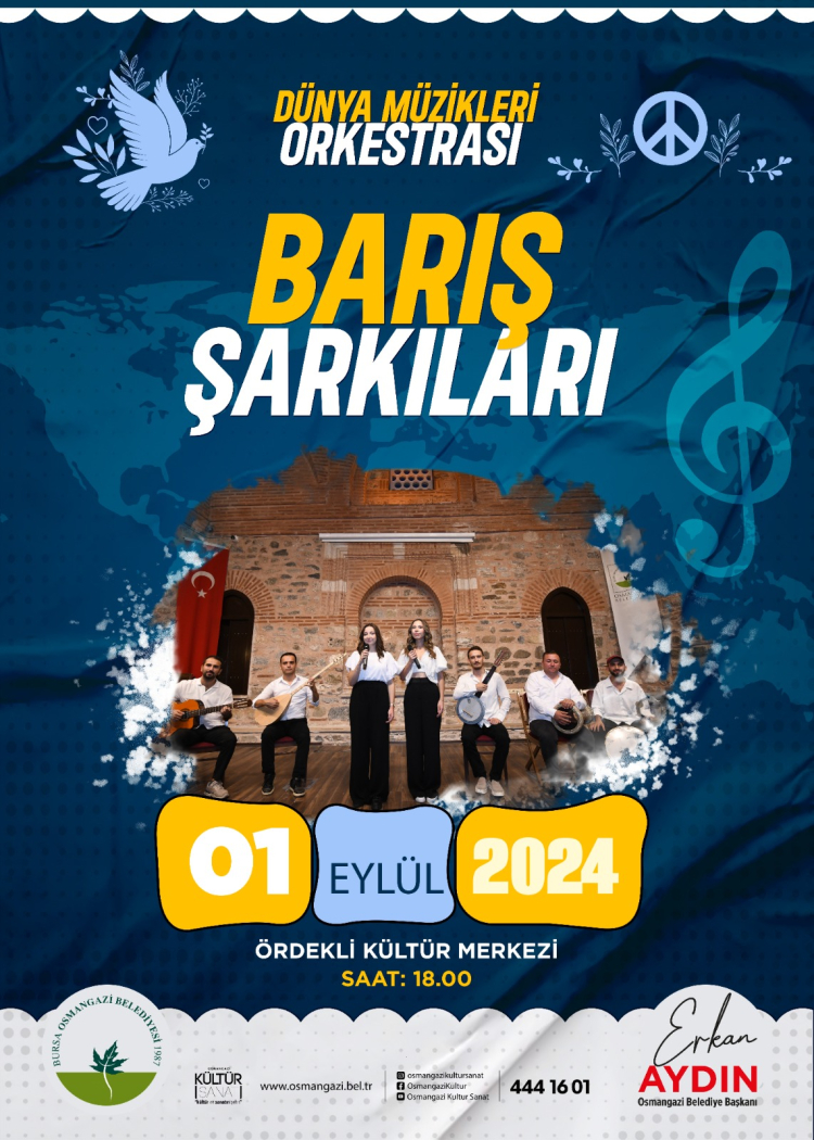 Bursa Osmangazi Belediyesi, 1 Eylül Dünya Barış Günü’ne özel konser düzenliyor. Osmangazi Dünya Müzikleri Orkestrası, tarafından verilecek olan ‘Barış Şarkıları’ konserinde, müziğin evrensel dili ile barış ve kardeşlik mesajları verilecek.