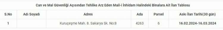 Yapı sahibi olarak, mail-i inhidam yapının tarafınızdan 10 gün içerisinde güvenliğinin alınarak yıkılması ve molozlarının kaldırılması gerekmektedir.