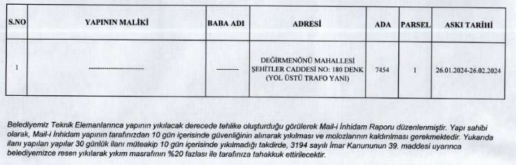 Yukarıda ilanı yapılan yapılar 30 günlük ilanı müteakip 10 gün içerisinde yıkılmadığı takdirde, 3194 sayılı İmar Kanununun 39. maddesi uyarınca belediyemizce resen yıkılarak yıkım masrafının %20 fazlası ile tarafınıza tahakkuk ettirilecektir.