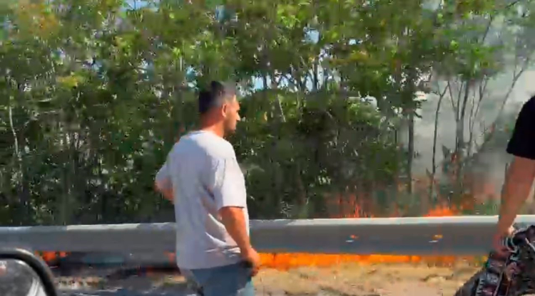 Bursa Şehir Hastanesi'nin karşısında bulunan alanda çıkan yangına yoldan geçen sürücüler, araçlarından çıkardıkları yangın söndürme tüpleriyle müdahale etmeye çalışıyor. Otoyol kenarına çıkan köylü çocuklar, yangına atmak için araçlardan su istiyor.