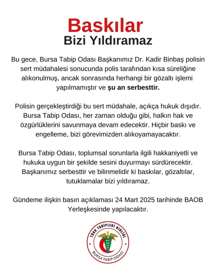 Bursa Tabip Odası, İBB Başkanı Ekrem İmamoğlu'nun tutuklanmasına karşı düzenlenen protestolarda Bursa Tabip Odası Başkanı Dr. Kadir Binbaş'ın alıkonulmasına tepki gösterdi.