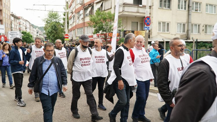 Bursa’da Stadyum Caddesi’nde başlayan büyük yürüyüşe katılan hekimler İşçi Bayramını kutladı.
